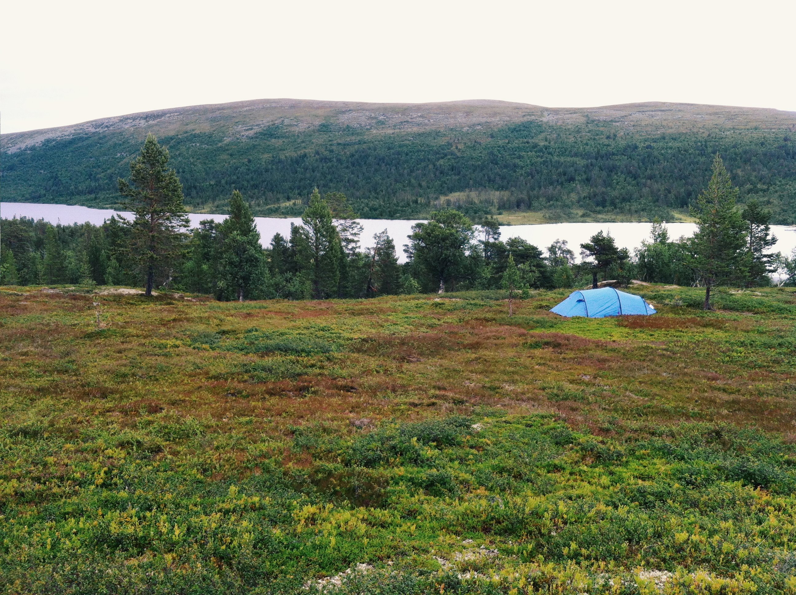 På eftermiddagen packade vi ihop full fjällpackning (med sovsäckar, liggunderlag, tält, trangiakök och mat) och gick på leden längs västra sidan av Grövelsjön. Målet var bara att gå så långt vi orkade och slå upp tältet på en fin plats. Vi kom ungefär en (!) kilometer innan vi hittade en riktigt mysig tältplats, så vi stannade där och ägnade resten av kvällen åt att gå på upptäcktsfärd längs små fjällbäckar.