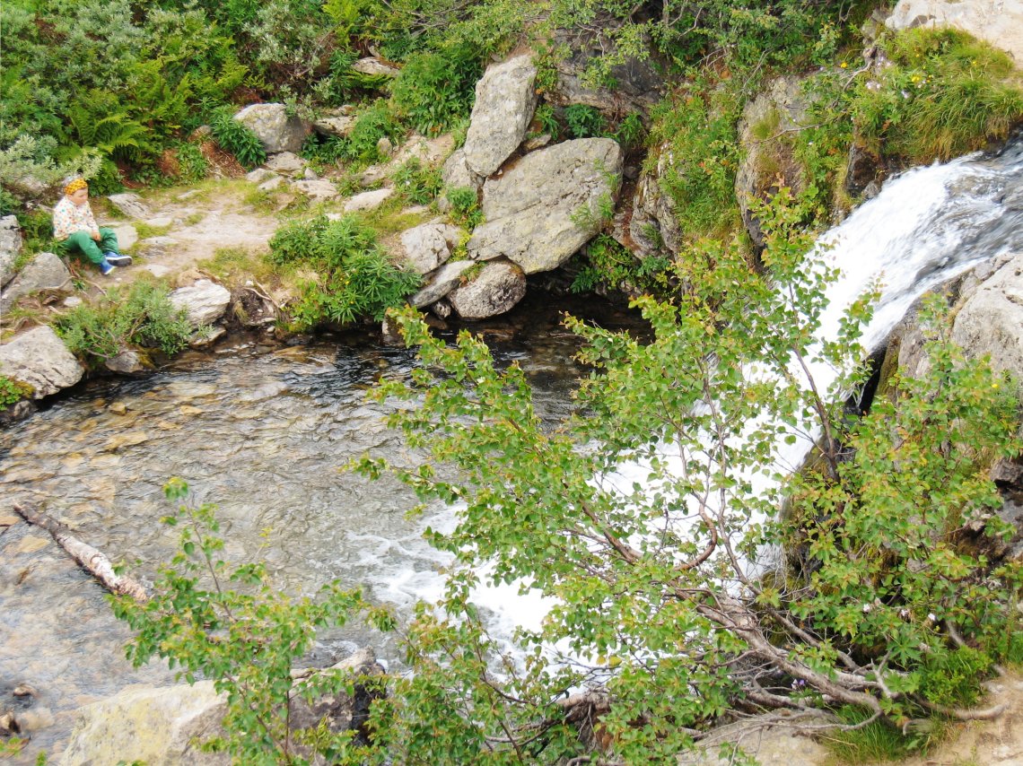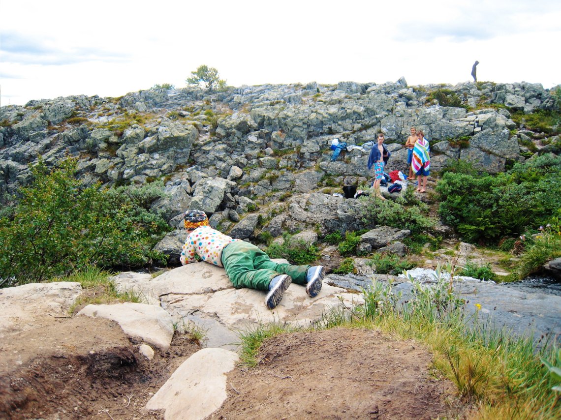 Vi hade med oss lunch i mattermosar och tog vår lunchrast vid fallet. Där kunde barnen bland annat spana på andra besökare som ville prova på att bada i det iskalla vattnet. Dricksvatten gick fint att ta direkt ur vattendraget som leder fram till fallet.