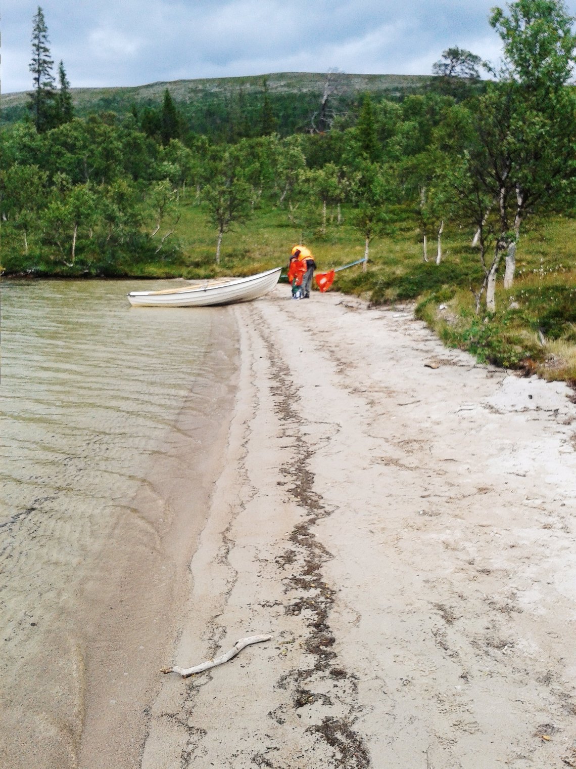 På förmiddagen var vi sugna på att ge oss ut på sjön. Båtar fanns att hyra vid Sjöstugan. Efter några förmaningar från ägaren om att ta det försiktigt (Grövelsjön kan snabbt blåsa upp, med höga vågor) så gav vi oss ut på en liten roddtur. Vi tog oss inte särskilt långt, men hade med lite fika och klev i land på en egen strand.
