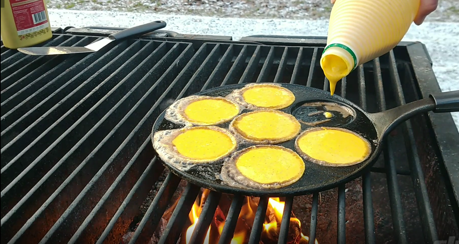 När du tillagar skrabbelurer ute behöver du ha bra fart på elden för att stekpannan ska bli tillräckligt varm. Tänk på att du behöver ha ett galler eller en plan yta för stekpannan, annars rinner smeten åt alla håll (eller bara åt ett håll …). Och en grytvante till pannan, annars blir det lite väl varmt.